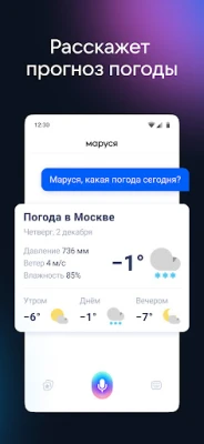 💭 Маруся, какая погода? Ассистент подскажет прогноз на день и выходные в любой точке мира. А ещё поставит будильник, напомнит о планах, почитает новости и скажет, сколько ехать до работы. Управление голосом поможет быстрее и проще решать повседневные дела.